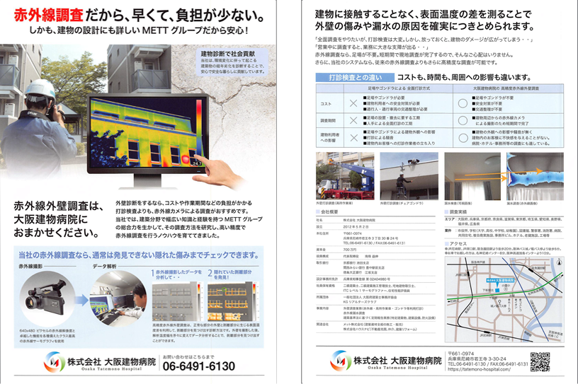 外壁診断をするなら、コストや作業期間などの負担がかかる打診検査よりも、赤外線カメラによる調査がおすすめです。当社では、建築分野で幅広い知識と経験を持つMETTグループの総合力を生かして、その調査方法を研究し、高い精度で赤外線調査を行うノウハウを育ててきました。